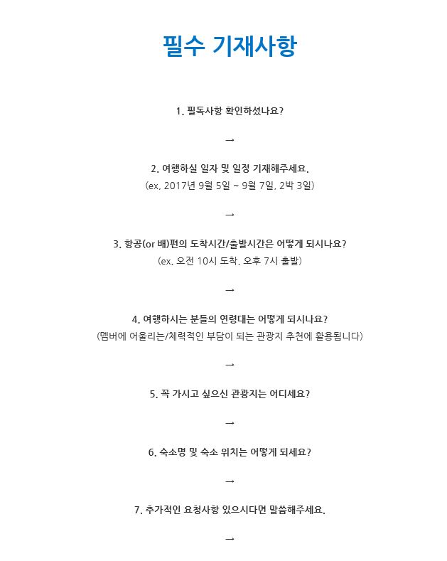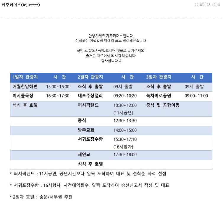 ![]() ![]() 카테고리로 들어가서 글쓰기를 누르면 저희가 미리 설정해놓은 글 양식이 나올거예요! 그 양식에 맞춰서 글을 등록하면 여행코스 신청 완료 ♡ 참 쉽죠잉? 여행코스 신청전에 필독사항은 꼭 한번씩 읽어주세요!! ![]() 저희가 등록 되어진 글을 확인하는대로 여행일정을 짜서 답변으로 남겨드립니다! 혹시나 문의사항이 있으시다면 다시 댓글로 남겨주세요 ♡ ![]() ![]() 제주커머스에서 정성을 담아 짜드린 제주도 여행코스가 마음에 들어 이렇게 댓글을 남겨주신다면 저희는 더 힘이 난답니다 :) ![]() 제주여행이 고민이라면 부담갖지말고 여행코스 문의 남겨주세요!!!