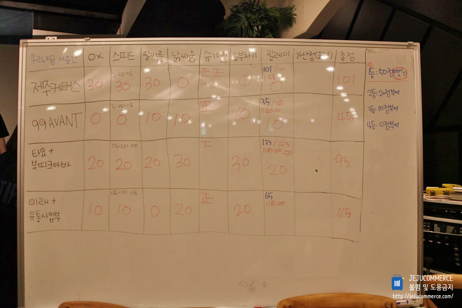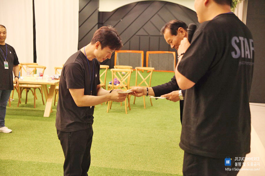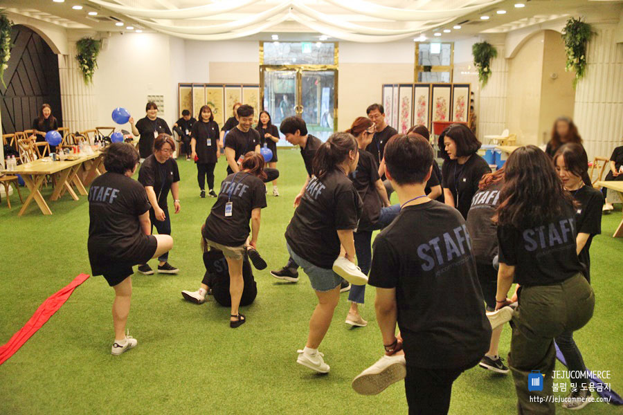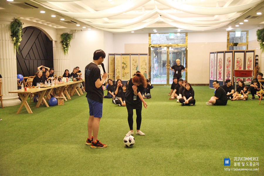 ![]() 정답을 맞출 때는 가수와 노래, 간단한 노래 한소절이면 되는데 가운데로 나와서 춤과 함께 하면 가산점도 팍팍! ![]() 슈가맨 다음으로 이어진 경기는 승부차기였어요 ㅎㅎ 일반 승부차기가 아닌 코끼리코 10바퀴 돈 후 진행하는 승부차기~ 다들 비틀비틀거리며 정신집중을 해 슛을 날리시는데 반 이상은 못넣으시더라구요 ㅎㅎ ![]() 마지막으로 진행된 경기는 릴레이경기였는데요 무려 50점이 걸려있는 경기! 그냥 50점도 아니고 원하는 팀에서 50점을 빼앗아 오는 경기였어서 모두가 1등을 노리는 게임이었어요 ㅎㅎ 릴레이 경기의 내용은 제주커머스 블로그 속 영상에서 확인해주세요! ![]() 두구두구두구 !!! 릴레이 경기의 우승팀은 미래컨벤션센터+유통사업부로 이 전까지 1위를 달리고 있던 타요키즈카페+부띠크아바의 점수 50점을 빼앗아 종합우승을 차지했어요! 워크샵 우승은 처음이라며 너무 좋아하시더라구요! 축하드립니다 ♥ ![]() 모든 경기가 끝나고 폐회선언에 앞서 시상식을 먼저 진행했어요 ㅎㅎ 가족상, 열정상, 응원상을 받은 팀들은 간식비, 최종우승을 한 팀은 회식비 지원, MVP에겐 상품권을 드렸답니다 !!! ![]() 폐회선언을 하고 난 후에는 모두가 다 함께 각자의 자리를 치우고 정리하며 질서있는 모습을 보여준 미래인들 :) ![]() 너무너무 재미있고 소중했던 2018 워크샵 우리, 지금 이 순간! 내년에도 모두 다 함께 했으면 좋겠어요 ㅎㅎ 다들 너무 고생많으셨습니다 ♥